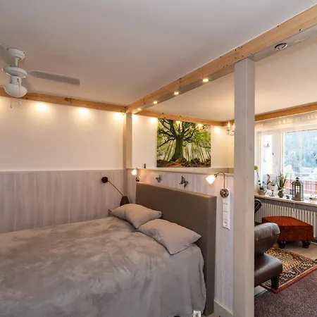 Wohlfuhloase Im Schwarzwald Mit Panoramablick Appartement van 48 m^2, gelegen op 1 km van het stadscentrum van Enzklösterle, biedt logeerkamers met uitzicht op de berg. Tijdens hun verblijf in het appartement kunnen gasten ook deelnemen aan activiteiten als wandelen, paardrijden en minigolf.
